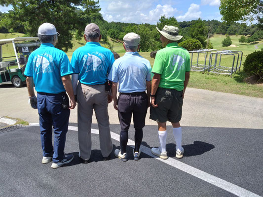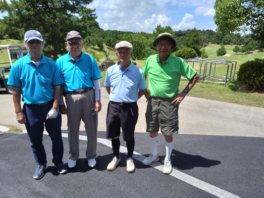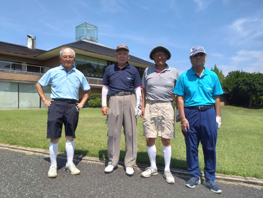 7月14日霞丘CCにて。左よりS43卒A爺、その横からS45卒3名。青緑系でまとめてみました