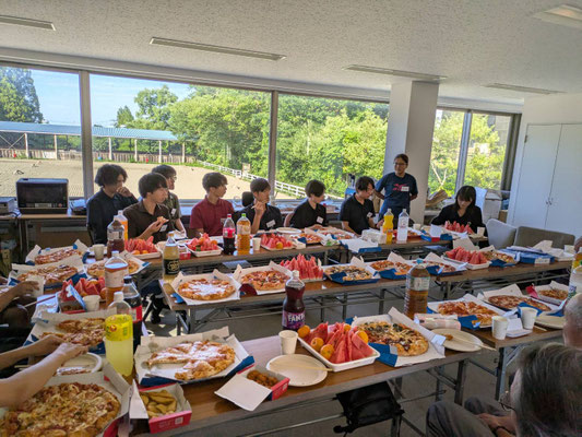 会場ではテーブルいっぱいに並んだピザとスイカに学生たちの歓声が上がり、笑顔が絶えないひとときとなりました。会の後には、馬たちもスイカをもらって食べていたようです。